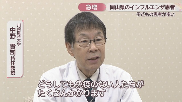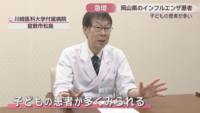 岡山県でインフルエンザの感染者が急増し、警報レベルに達しました。専門家は子どもの患者が多いとして注意を呼び掛けています。