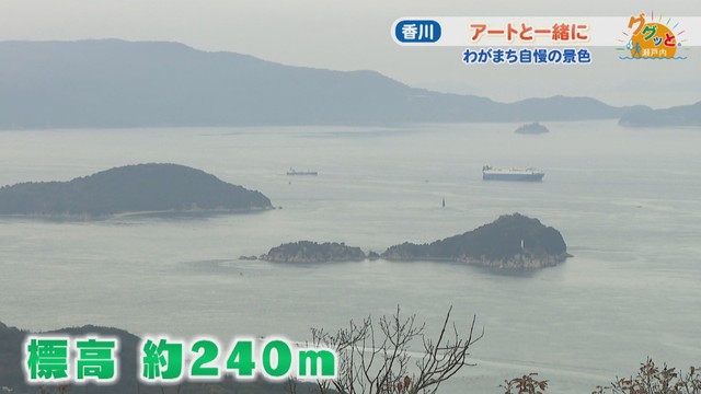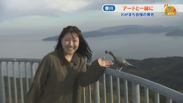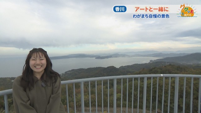 「展望台を上がると……わー! きれいな海ですよ。この場所は半島になっているので、いろんな方向から穏やかな瀬戸内の景色を楽しめるんです」