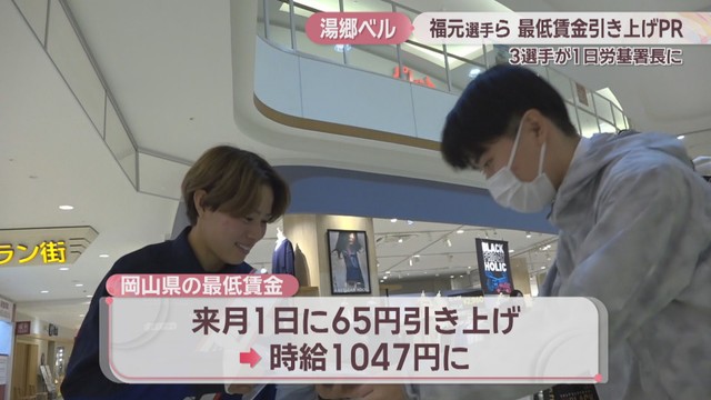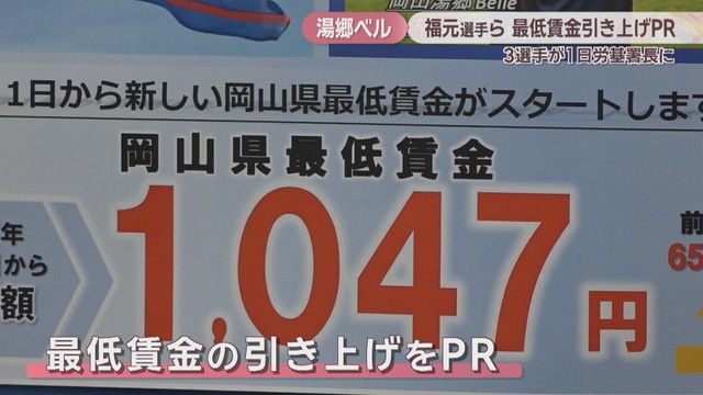 1日署長に就任したのは、岡山湯郷ベルの福元美穂選手、内田好美選手、中野琴音選手です。12月1日に岡山県の最低賃金が引き上げられることをPRする取り組みです。