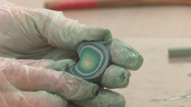 さまざまな色の漆を約20層重ねたものを機械や手作業で削り、好きな形や色に整え、ブローチやキーホルダーを作りました。