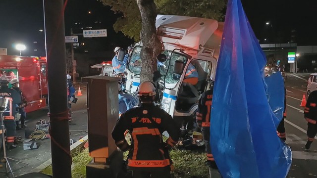 1日夜、高松市で大型トラックが中央分離帯の街路樹に衝突し、男性運転手がけがをして病院に搬送されました。