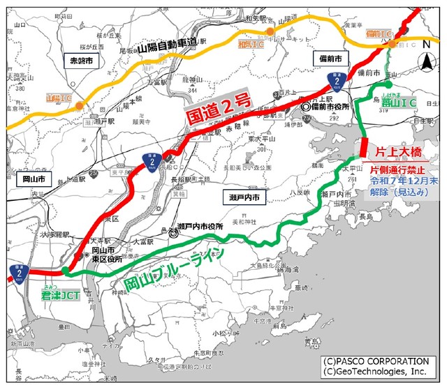 備前市穂浪~瀬戸内市邑久町虫明を結ぶ片上大橋は、橋げたに亀裂が見つかったため、10月から片側通行禁止となっています。また、県は大型車に対して国道2号などへう回するよう呼び掛けています。