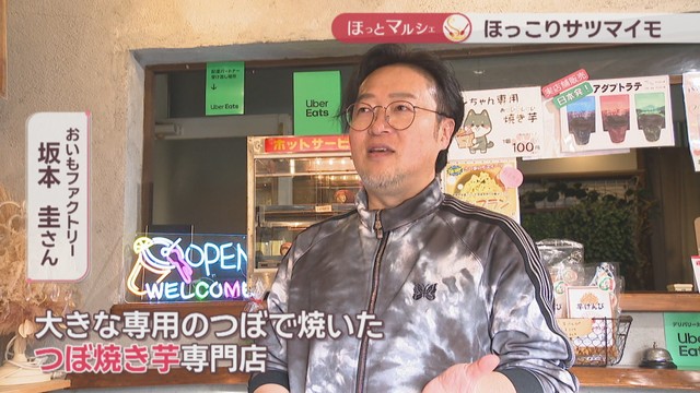 「大きな専用のつぼで焼いた、つぼ焼き芋専門店。つぼの遠赤外線と炭で焼くので、炭の遠赤外線。ダブルで中までしっかり焼ける。サツマイモは、契約農家さんの大分の甘太くん、甘兵衛という紅はるかの種類があって、それを取り寄せているんですけど、あとは時期によって市場から取り寄せています」