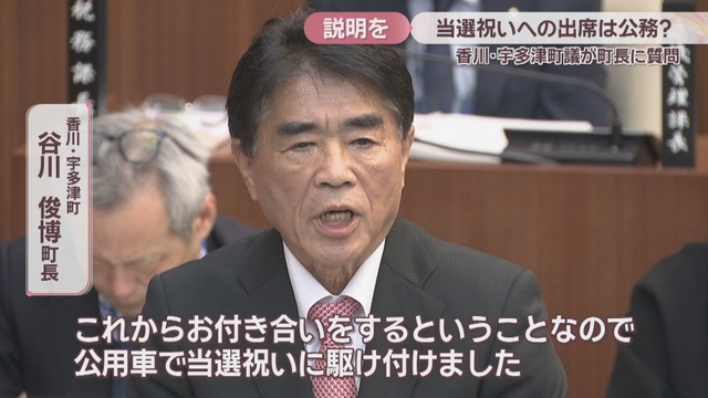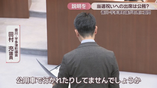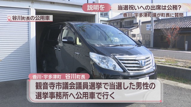 県内の他自治体の選挙の当選祝いで公用車を使うのは公務外の利用として、香川県宇多津町の町議会議員が5日、町長に説明を求めました
