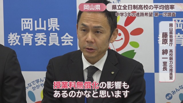 岡山県教育委員会が中学3年生の進路希望調査の結果をまとめました。高校授業料無償化の影響もあり、県立全日制高校の平均倍率は1.03倍と過去最低となりました。