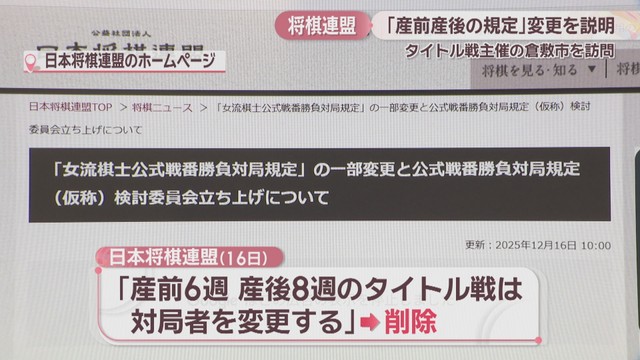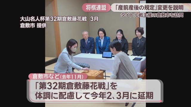 日本将棋連盟は、16日、妊娠や出産で女流タイトル戦が事実上の不戦敗となる規定を削除すると発表しました。将棋連盟は、18日、タイトル戦の1つ「倉敷藤花戦」を主催する岡山県倉敷市を訪問し、経緯などを説明しました。