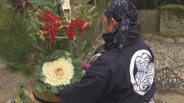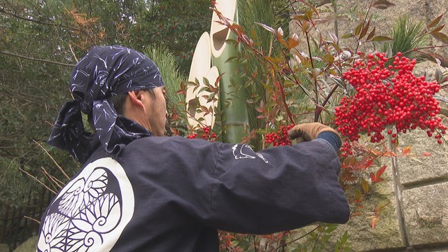続いて、「難を転ずる」という意味が込められた南天や紅白の葉牡丹などの縁起物を飾り付けると……高さ約2mの門松が完成しました。