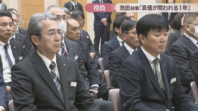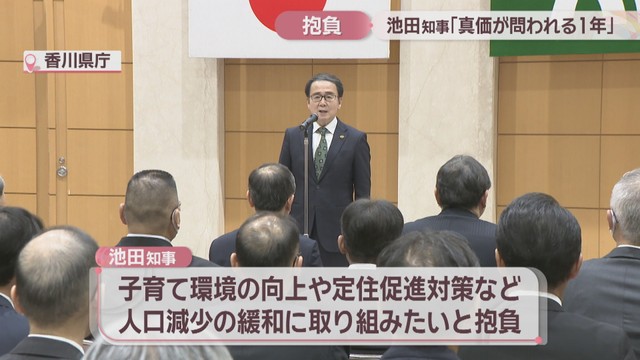 香川県の池田知事は幹部職員ら約50人を前に、子育て環境の向上や定住促進対策などに力を入れて人口減少の緩和に取り組みたいと抱負を語りました。