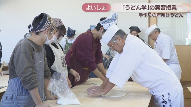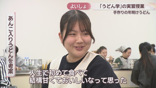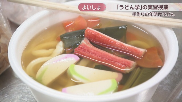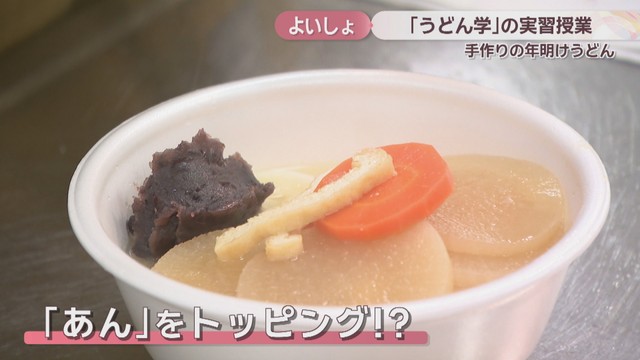 高松市の大学の名物講義「うどん学」。7日は学生が麺を手打ちして年明けうどんを作ったんですが、中には驚きのトッピングに挑戦したグループもありました。