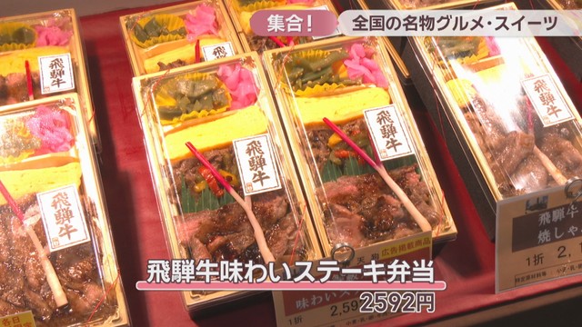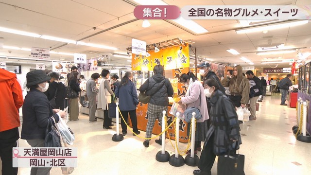 岡山市の天満屋岡山店で始まった「全国うまいもの味くらべ」です。期間中、全国28の都道府県から約1100種類の名物グルメ・スイーツが並びます。
