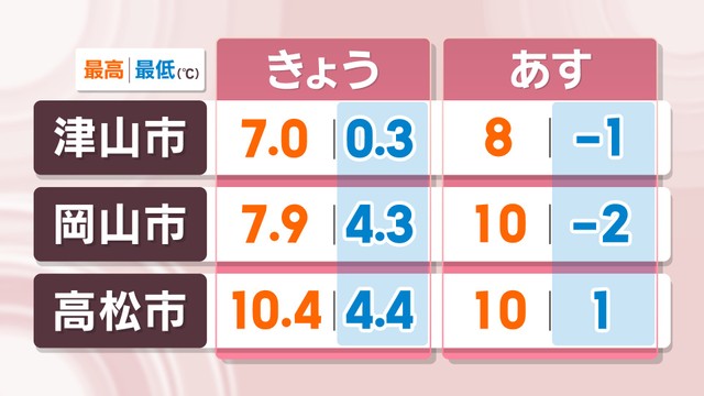 ただし、朝までは寒気が残り、放射冷却の影響で最低気温が8日朝よりも下がる予想で、岡山市は8日より6℃以上低くなりそうです。8日夜はあたたかくしてお休みください。また、9日は路面の凍結にご注意ください。