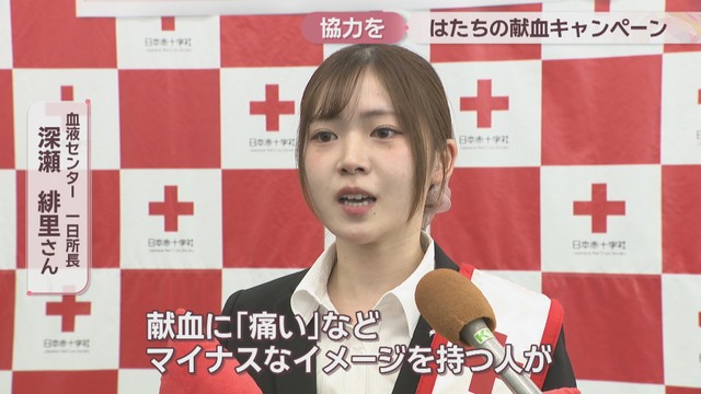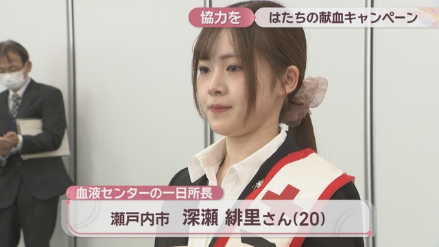 岡山県赤十字血液センターの一日所長を務める瀬戸内市の二十歳、深瀬緋里さんが献血を呼び掛けました。