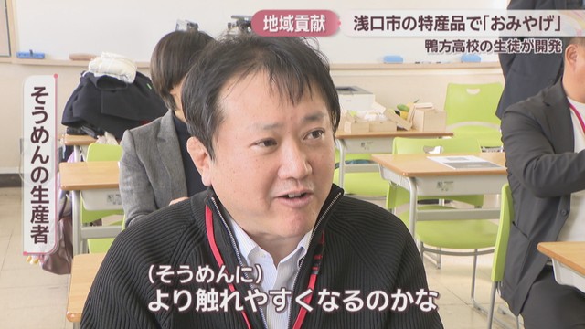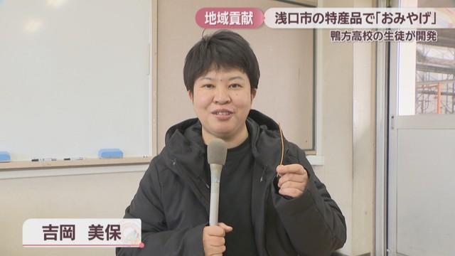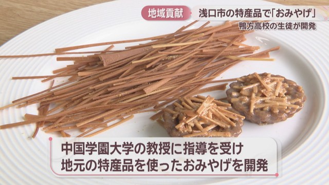実践的な学びを通して地域に貢献しようと、中国学園大学の教授に指導を受けながら、地元の特産品を使ったおみやげを開発しました。