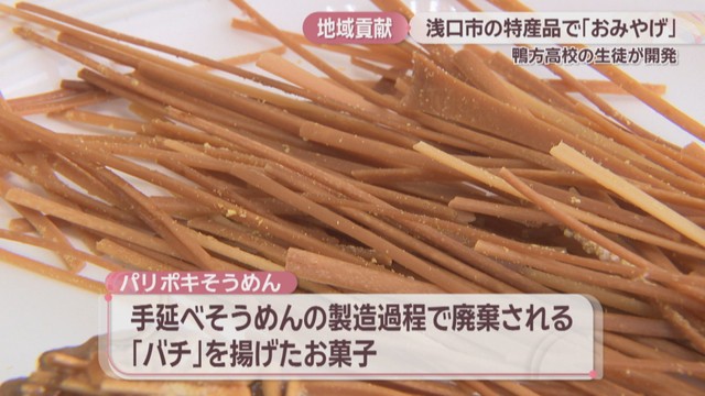 「パリポキそうめん」は、鴨方地区でさかんな手延べそうめんの製造過程で廃棄される麺の端の部分、「バチ」を揚げたお菓子です。
