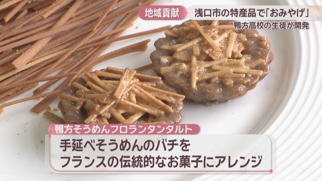 「鴨方そうめんフロランタンタルト」は、手延べそうめんのバチをフランスの伝統的なお菓子にアレンジしたものです。