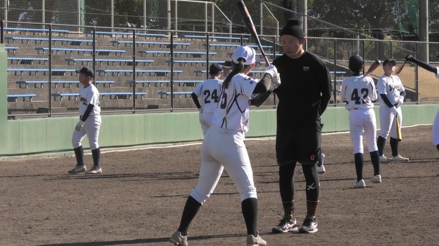 10日は、午前は硬式球、午後は軟式球の2部に分かれて行われ、小中学生や尽誠学園高校の女子硬式野球部の選手たちが参加。矢野さんはキャッチボールや守備、バッティングなどについて、身振り手振りを交えながら指導していました。