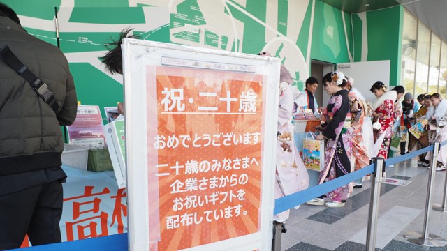 11日、「二十歳のつどい」が開かれた高松市の会場で、県内外の20社が協力して、二十歳の人たちにプレゼントを配りました。