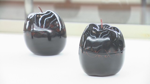 黒くツヤのあるリンゴ。ひときわ目を引く大きなアンモナイト。香川県漆芸研究所の研究生の修了作品16点が会場に展示されています。