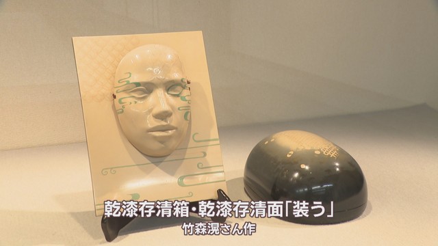 竹森滉さんの作品「装う」は、自分の顔を原型にした面です。剣や彫刻刀で漆を削って細かい模様を付けたそうです。