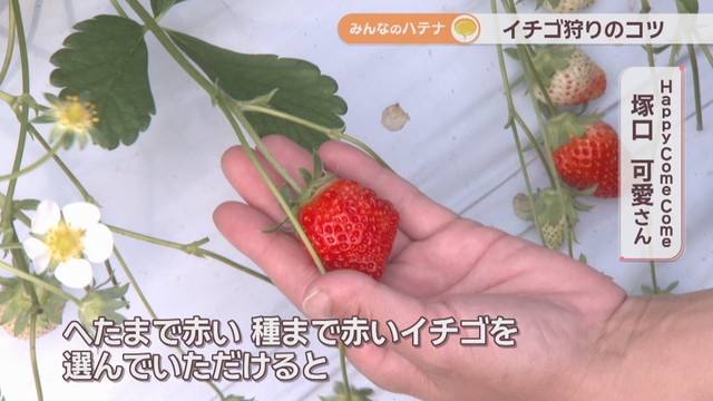 「皆さん、いちご狩りに来られるとこういった大きいものを選びがちなんですが、これはまだへたの方が赤くなっていないので、選んでいただくのはこういったへたまで赤い、種まで赤いイチゴを選んでいただけるとおいしさを楽しんでいただけると思います」