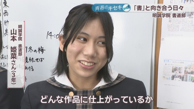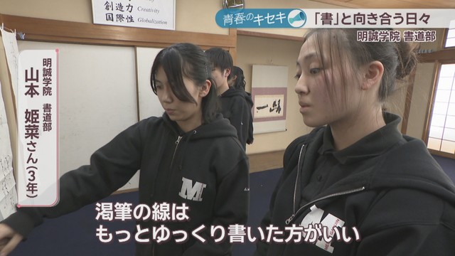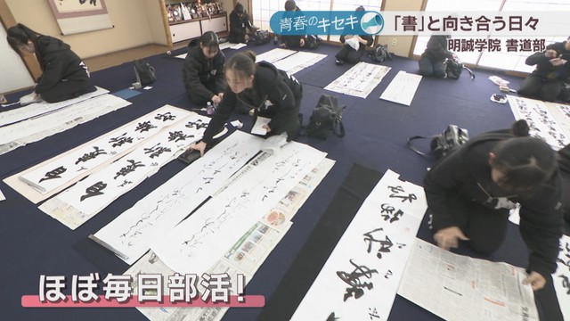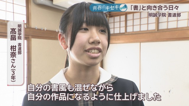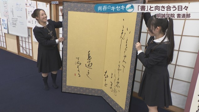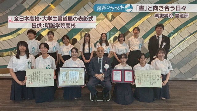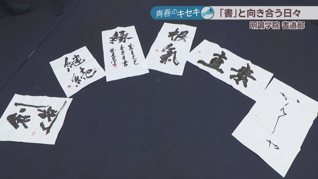 明誠学院高校は全日本高校・大学生書道展の高校生の部で団体2位や、国際高校生選抜書展の団体の部で全国準優勝など、数々の全国大会で上位に入賞。3年生を中心に輝かしい成績を収めています。