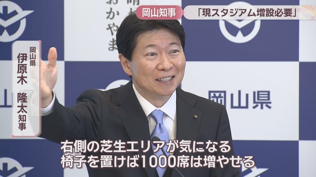 岡山県の伊原木知事は、新しいスタジアムの整備について協議体を設置して検討を進めるとした上で、現在のスタジアムの座席を増やす必要があると述べました。