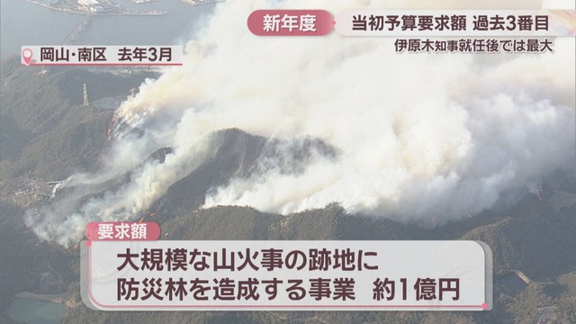 2025年3月に岡山市南区で発生した山火事の跡地に防災林を造成する事業が約1億円です。