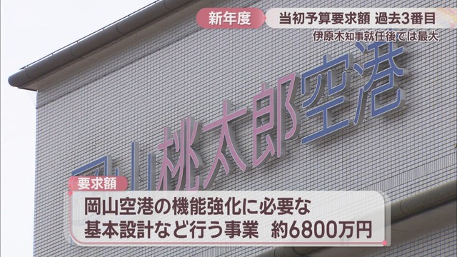 岡山空港の国際線が2便同時に発着できるようにするなど、機能強化に向けた基本設計などを行う事業が約6800万円です。