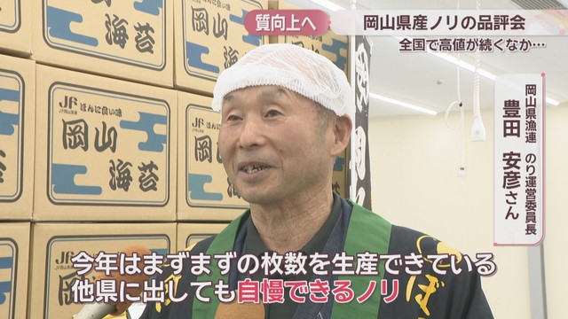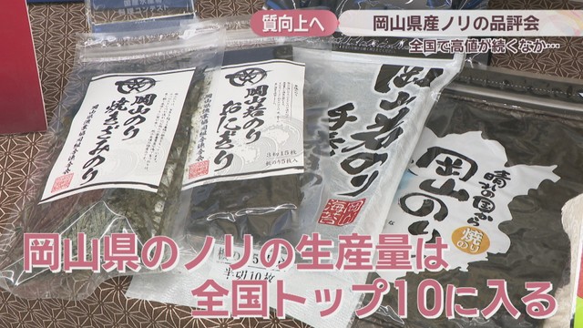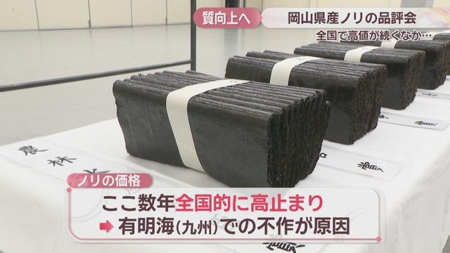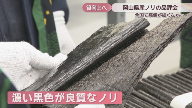 ここ数年の不作により、「ノリ」の価格が高止まりする中、岡山市で16日、ノリの品評会が開かれました。