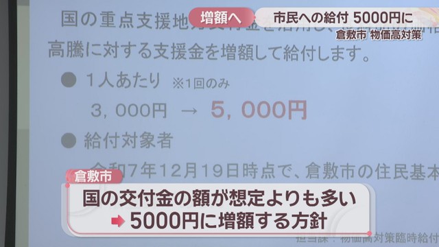 2025年12月の倉敷市議会で物価高対策として市民1人当たり3000円を給付することが決まりましたが、国の交付金の額が想定よりも多かったとして、2000円増額し5000円とする方針を決めました。市は、2月下旬から順次給付したいとしています。