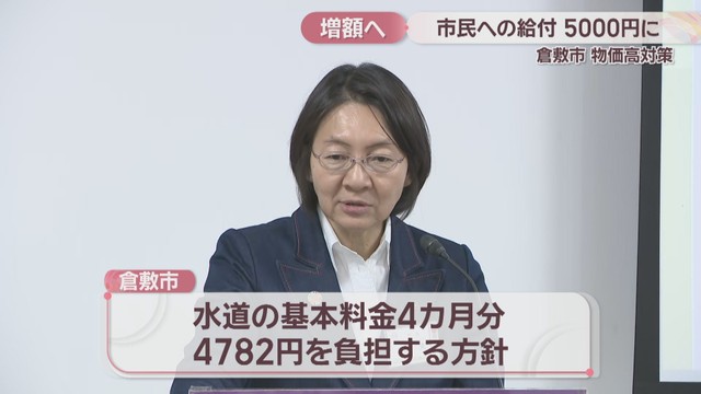 岡山県倉敷市は、物価高対策で国の交付金を活用して市民に給付する現金を3000円から5000円に増額する方針を決めました。16日、伊東市長が会見を開いて明らかにしました。