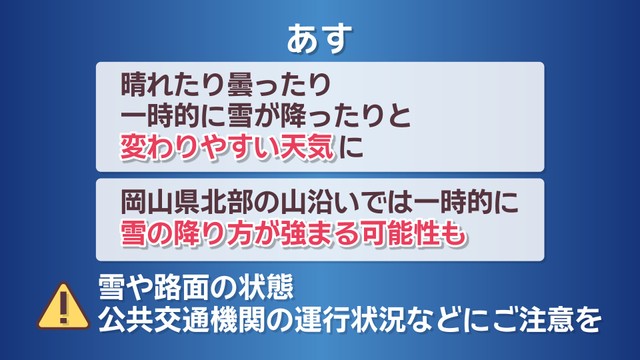 岡山県北部の山沿いでは一時的に雪の降り方が強まる可能性があります。お出掛けの際は雪や路面の状態、公共交通機関の運行状況などにご注意ください。