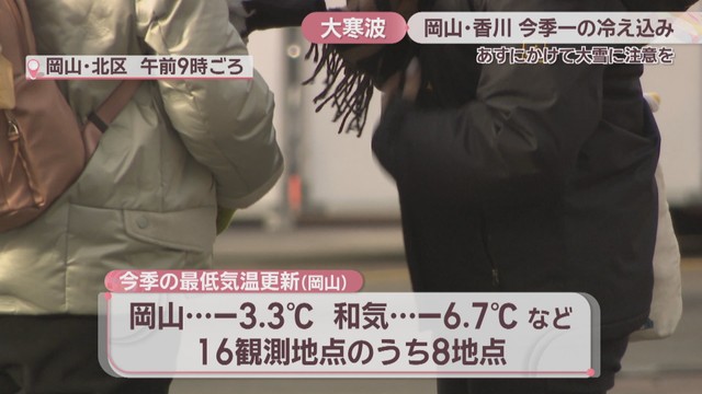 今シーズンの最低気温を更新したのは、岡山県では岡山で-3.3℃や和気で-6.7℃など、16の観測地点のうち8地点。