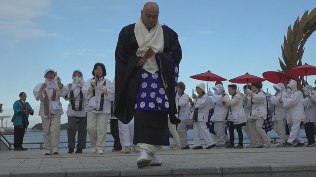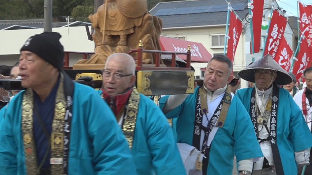 21日朝の小豆島はぐっと冷え込んだ中、寺院の関係者や一般の参列者など約150人が港町を進みます。