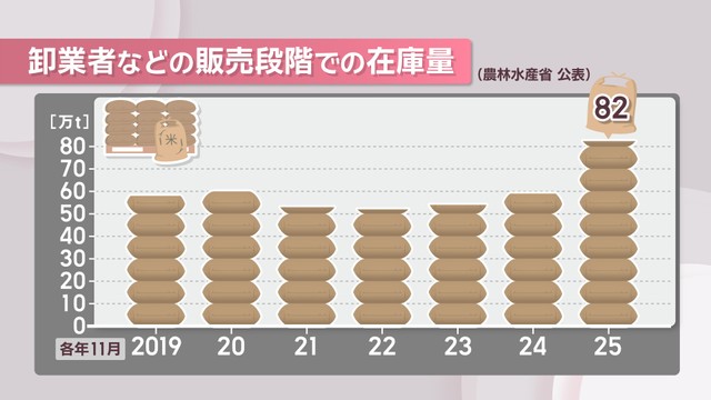 そうした中で卸業者などの販売段階での玄米の在庫量をみると、最新のデータでは2025年11月に82万tと過去6年の同じ時期でみると、在庫は最も多くなっているのが分かります。