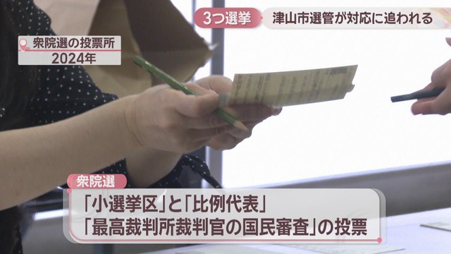 衆院選では、「小選挙区」と「比例代表」、さらに「最高裁判所裁判官の国民審査」と3つの投票が行われます。これに市長選・市議補選が加わる津山市。