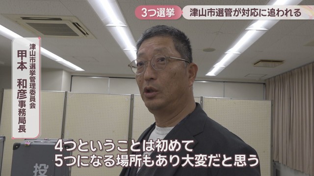 津山市では2月8日、衆院選に加えて市長選と市議会議員補欠選挙の投開票日が重なり、職員が慌ただしく準備を進めていました。