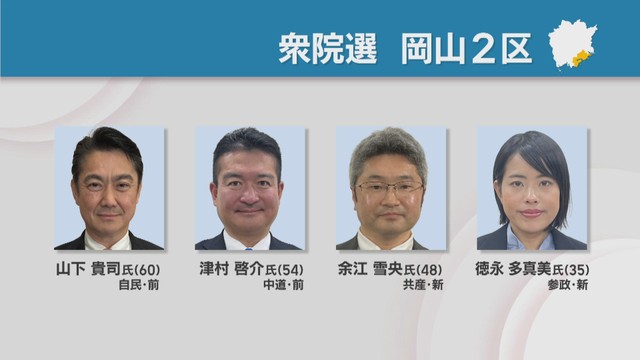 岡山2区に立候補を予定しているのは、自民党前職の山下貴司さん(60)、中道改革連合前職の津村啓介さん(54)、共産党新人の余江雪央さん(48)、参政党新人の徳永多真美さん(35)です。