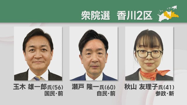 香川2区には届け出順に国民民主党前職の玉木雄一郎さん(56)、自民党前職の瀬戸隆一さん(60)、参政党新人の秋山友理子さん(41)が立候補しました。