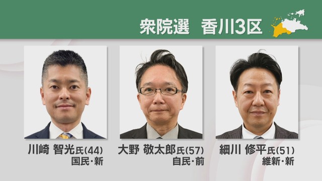 香川3区に立候補したのは国民・新人の川崎智光さん(44)、自民・前職の大野敬太郎さん(57)、維新・新人の細川修平さん(51)の3人です。