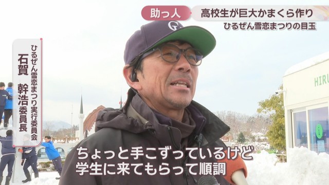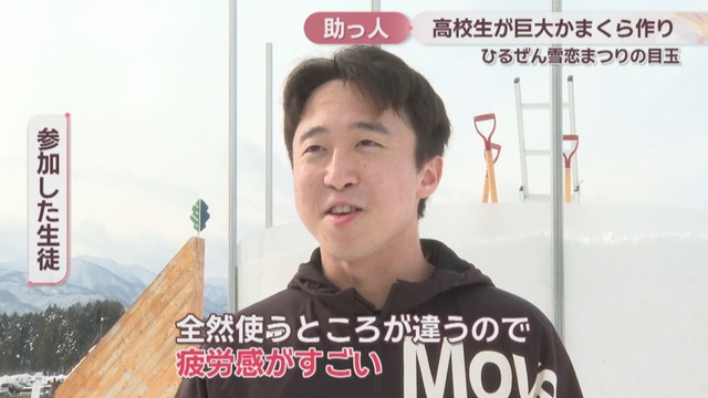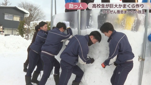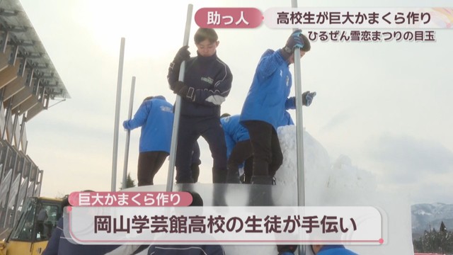 巨大かまくら作りに岡山学芸館高校の生徒約35人が、助っ人で参加しました。
