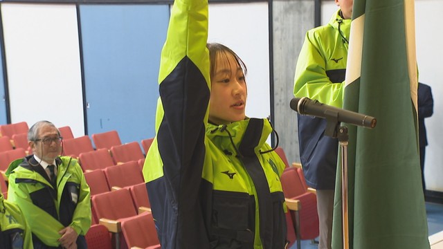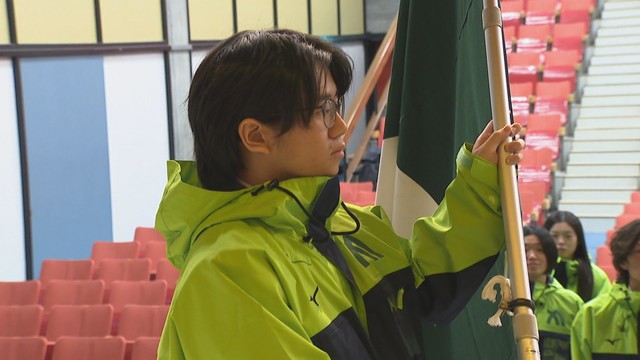 28日の壮行式では、旗手を務めるスキー・少年男子の藤井高校の木下将仁郎選手ら2人にそれぞれ団旗が手渡されました。