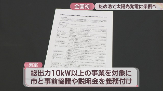 市によると、ため池に特化した太陽光発電の条例は全国初で、3月議会で提案し、4月1日の施行を目指しています。