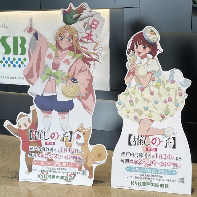 そのプロジェクトの一環で、KSB高松本社と岡山本社の1階ロビーに、桃太郎に扮したルビーとおいりをモチーフにした衣装を着た有馬かなの等身大パネルが登場しました。