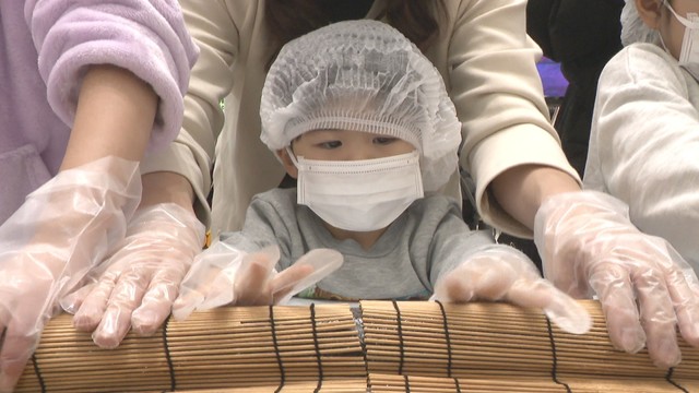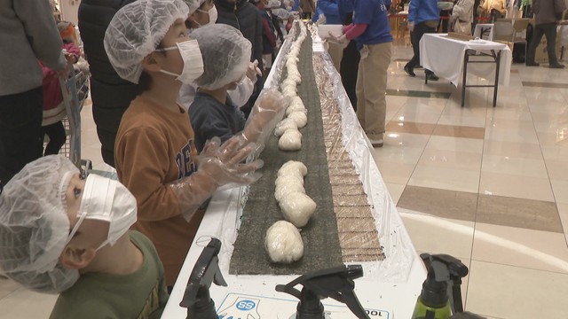 会場に用意されたのは長さ約12メートルの県産ノリ。30組の家族連れがジャンボ恵方巻き作りに挑戦しました。