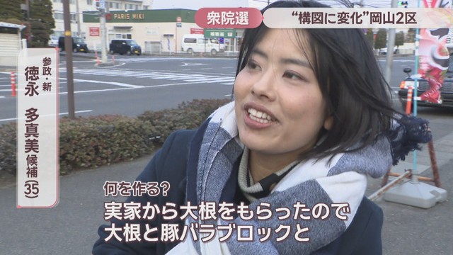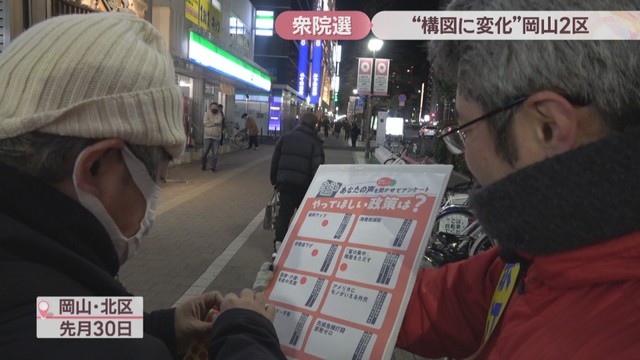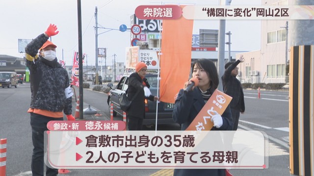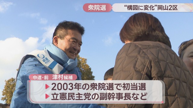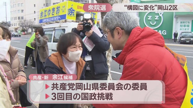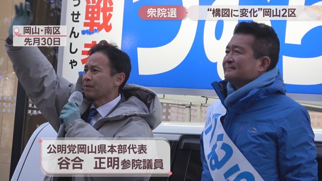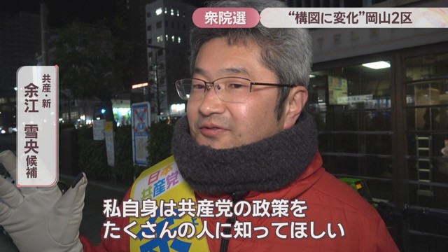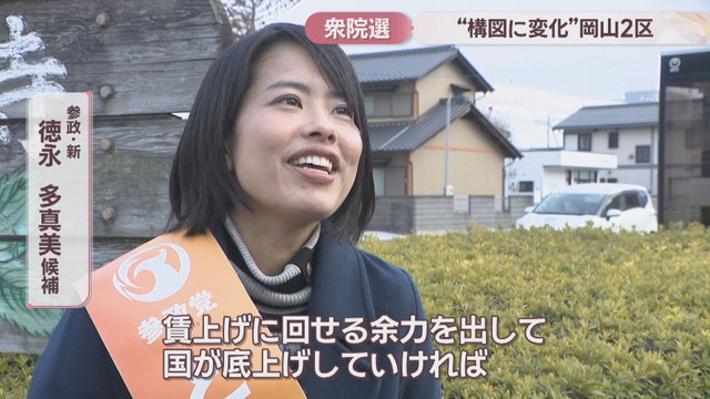 衆院選の激戦区、岡山2区についてお伝えします。岡山市中区と南区、玉野市と瀬戸内市を選挙区とする岡山2区には、自民と中道の前職、それに参政と共産の新人の合わせて4人が立候補しています。