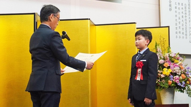 高松市立栗林小学校4年の内藤理仁さんは「食を育む」で、同じく農林水産大臣賞(条幅の部)を受賞しました。