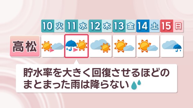 しかしウェザーニューズによると、貯水率を大きく回復させるほどのまとまった雨は降らない見込みです。