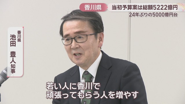 香川県の新年度の一般会計当初予算案は総額約5222億円です。2025年度より約255億円多く、24年ぶりに5000億円台規模となりました。当初予算案では香川県が基本目標に掲げる「人生100年時代のフロンティア県」実現に向けた17の重点政策に取り組むとしています。