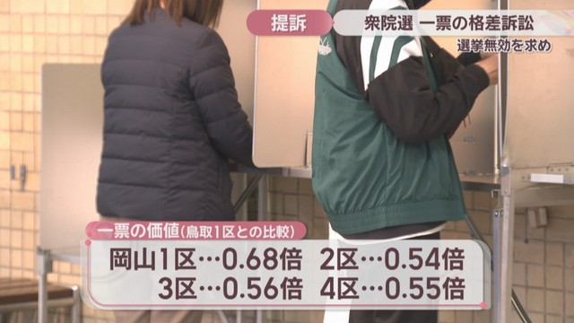 岡山県の選挙区と全国で有権者数が最も少ない鳥取1区の一票の価値を比べると、岡山1区で0.68倍、2区で0.54倍、3区で0.56倍、4区で0.55倍しかないとしています。